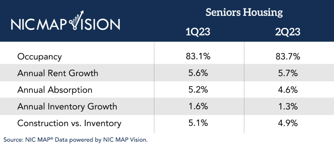 ANNAPOLIS, Md. — The occupancy rate for private-pay seniors housing rose 60 basis points to 83.7 percent in the second quarter of 2023, according to data from NIC MAP Vision. It is the eighth consecutive quarter where occupancy has increased as the industry continues to recover from impacts of the COVID-19 pandemic. The occupancy number is a 590 basis point increase over the pandemic low of 77.8 percent in second-quarter 2021, but still short of the pre-pandemic mark of 87.1 percent in first-quarter 2020. NIC MAP Vision is a product …