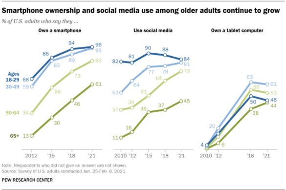 On several fronts, the adoption of key technologies by those in the oldest age group has grown markedly since about a decade ago, and the gap between the oldest and youngest adults has narrowed. Seniors own and use more mobile devices than ever before. According to Pew Research, smartphone adoption for adults ages 65+ is 61 percent.