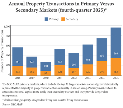 The surprising strength of seniors housing in secondary and tertiary markets nationally compared with the primary markets has captured investors’ attention.